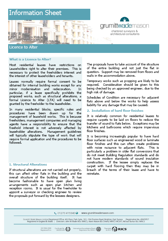 Leases normally require formal consent to be obtained for internal building works except for any minor modernisation and redecoration. In particular, if a lease specifically prohibits the proposed works, such as structural alterations, a formal Licence to Alter (LTA) will need to be granted by the freeholder to the leaseholder.